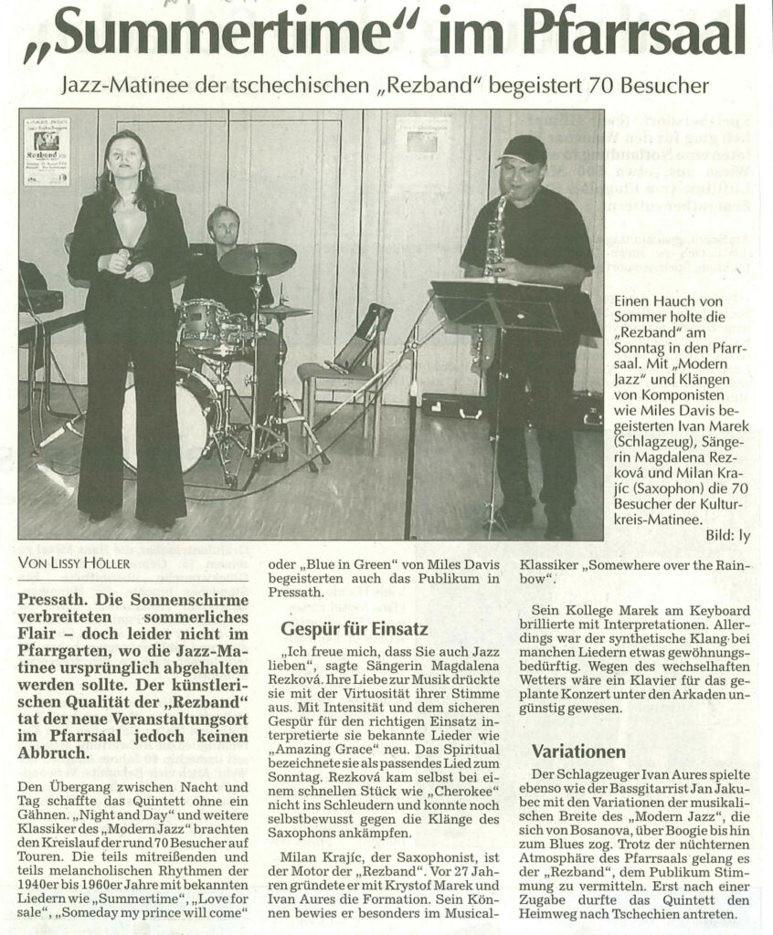 Jazz-Matinee mit der tschechischen „Rezband“von adminin Pressean Veröffentlicht am 13/03/202613/03/2026 24. August 2004, Der Neue Tag FacebookShare on XLinkedInWhatsAppEmailCopy Link